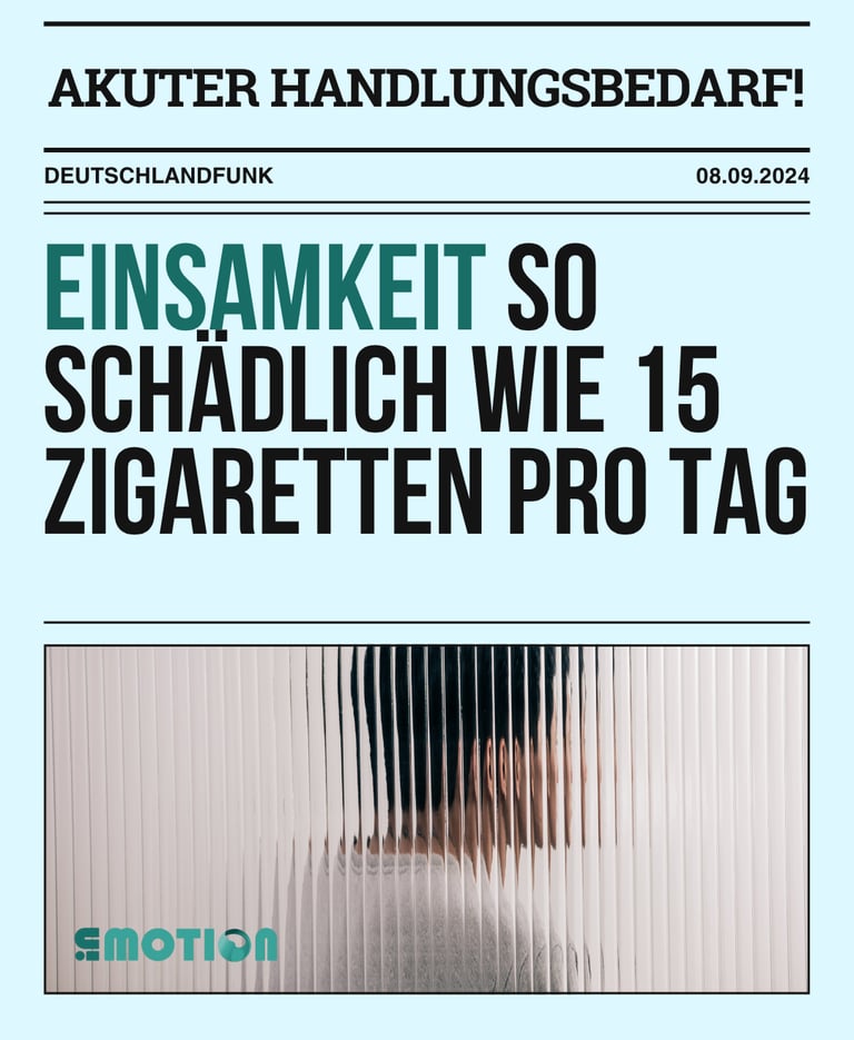 Einsamkeit ist ein biologisches Warnsignal (Matthews et al., 2023). Sie ist Ausdruck einer Gesellschaft, die die Verbindung verloren hat. Hinter der wachsenden Einsamkeit steckt eine tiefere gesellschaftliche Krise. Eine Krise des Miteinanders, der mentalen Gesundheit und der Demokratie. Wir wollen sie sichtbar machen. Mit Klarheit, Verbindung & politischer Kraft. 🔥
